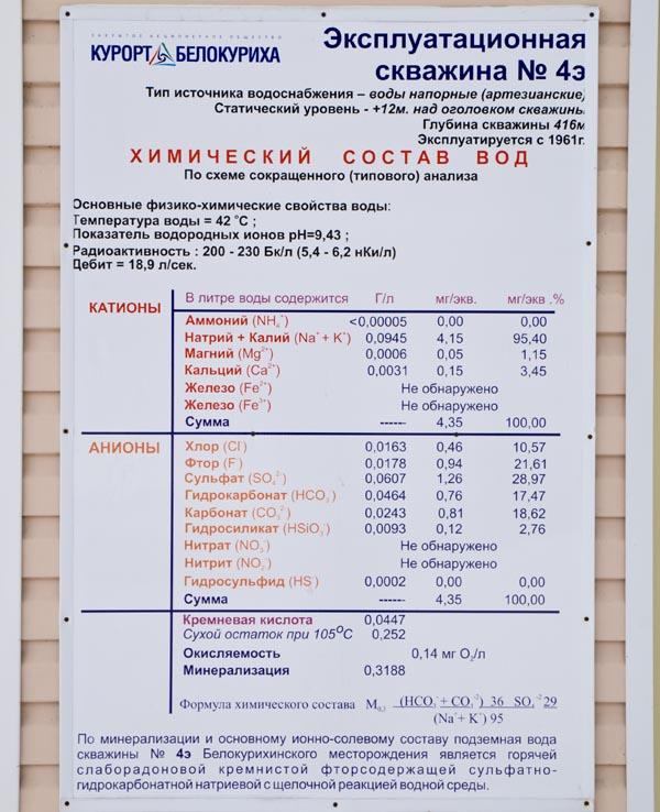 Собираясь в полостях, вода проходит различные породы, обогащается микроэлементами и биологически активными веществами. У всех, кто знаком с курортом Белокуриха, на слуху слово «радон». Но не только радон делает белокурихинскую воду целебной. К слову, термы Белокурихи относятся к слаборадоновым. Лечебное воздействие минеральной воды объясняется также присутствием в ней азота, солей кремниевой кислоты, гидрокарбонатов, сульфатов, натрия, примесью редких металлов, благородных газов. В общем, белокурихинская вода - пособие по изучению периодической таблицы Менделеева