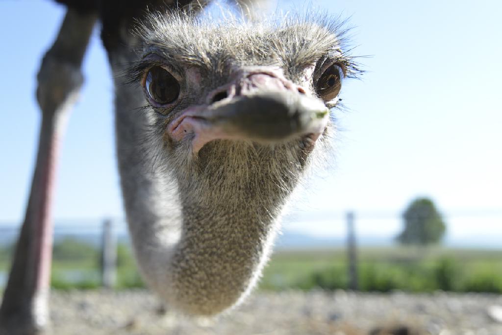 У следующего загона нас с большим любопытством встречает страус. Ну и глазищи!