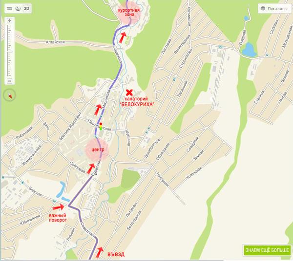 Если вы приехали на машине, то все очень просто. Едем по главной, там, где указатель «Курорт Белокуриха», поворачиваем направо. Проезжаем центр города, светофор, отсюда берет начало линия санаториев и отелей.