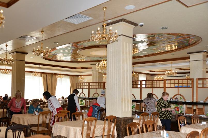 Не смогла отказать себе в соблазне еще и отобедать. Всего ассортимента блюд не перечислишь, но все довольно аппетитное и вкусно пахнущее. Начала с того, что положила на тарелку несколько блюд понемногу, чтобы их попробовать и подойти за другими. Но в следующий заход взяла то же самое! В этот раз «вкусно» победило «любопытно». Насытившись, оглядела еще раз обстановку в ресторане, расспросила персонал. Возле каждого блюда стоит бейдж, на котором написан состав используемых продуктов и количество калорий. Специй кладут совсем немножко, чтобы сохранить вкус, поэтому все по-домашнему. Мясо, молоко и овощи закупаются у местных фермеров, все натуральное, как говорят европейцы, «bio» (у них кстати это страшно ценится). Травяные чаи, алтайский мед, кисломолочная продукция по вечерам, и даже хлеб в санатории «Белокуриха» пекут сами, из муки алтайских производителей.