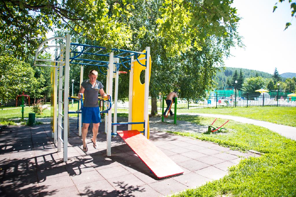 Спортивную тему продолжает ряд уличных тренажеров. Конечно, в санатории «Белокуриха» есть целый комплекс крытых спортзалов. Но занятия на свежем воздухе - это отдельное удовольствие