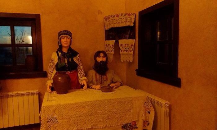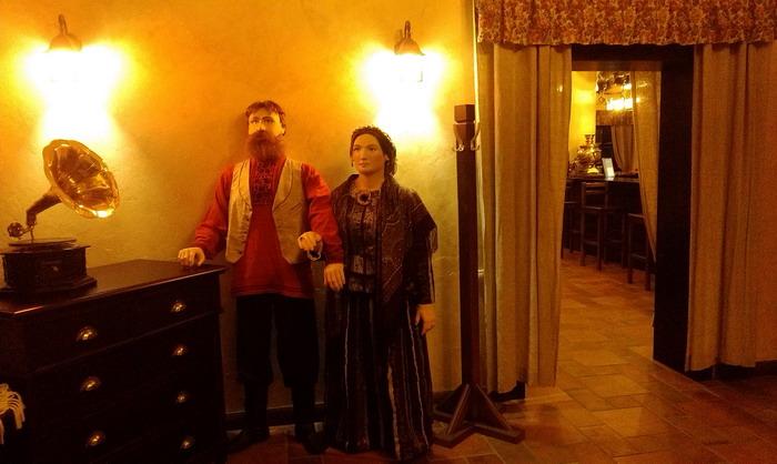 Заглянули сегодня в тот самый ресторан, .<...> он же «Дилижанс» что на Сибирском подворье.  Заведение, что снаружи, что изнутри  отделано весьма стильно <...>. На входе нас встретили фигуры русских то ли селян, то ли купцов, со своими благоверными.