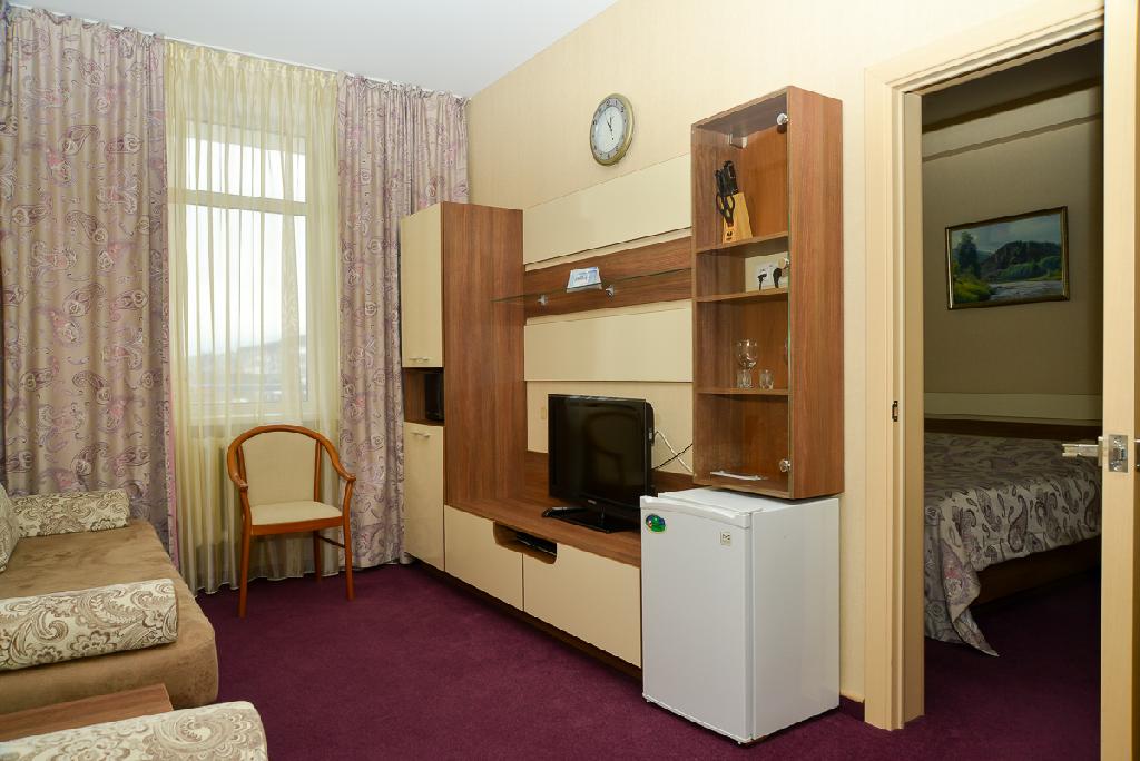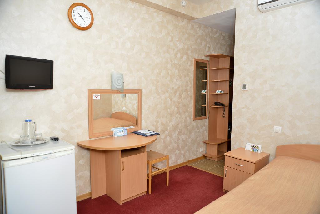 Как и полагается номеру повышенной комфортности, здесь есть не только полный набор посуды, ЖК-телевизор, DVD, но также кондиционер, сейф, утюг и микроволновая печь: