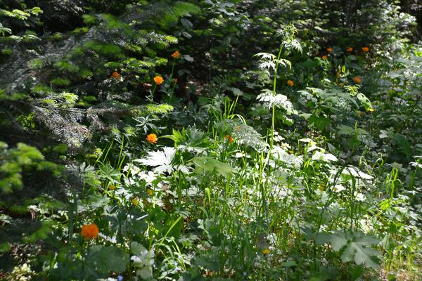 Огненно-яркие цветы, которые растут в лесу - жарки, занесены в Красную Книгу как исчезающий вид. Здесь они встречаются повсюду.
