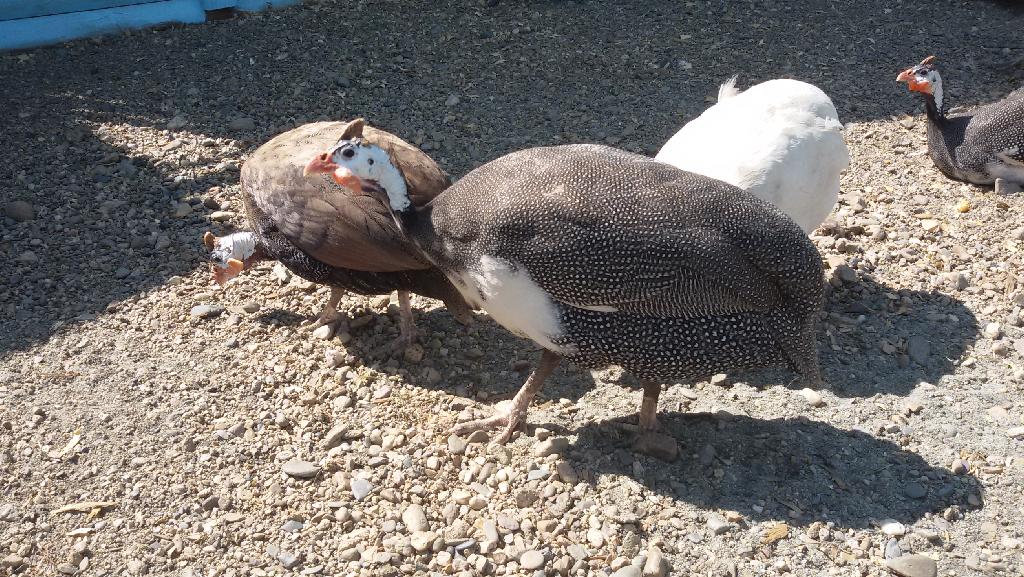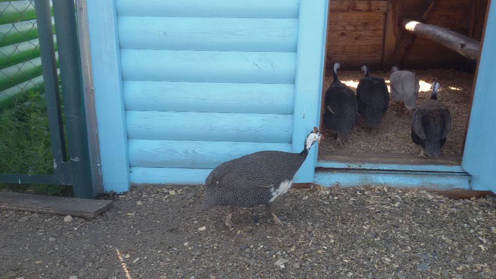 Еще одни новые обитатели "Сибирского подворья" - цесарки, - еще не привыкли к людям, поэтому прячутся от меня в своем новом красивом домике.