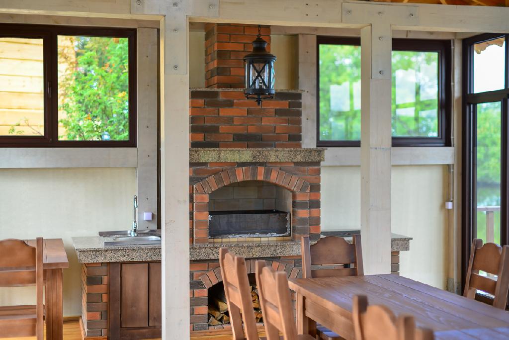 Непосредственно в беседке стоит печь, где можно запекать мясо на открытом огне или углях, рядом печь для приготовления блюд в казане.