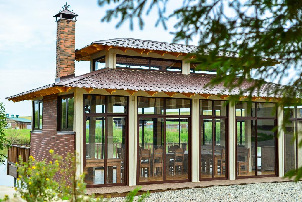 Беседка стоит прямо у воды, на берегу небольшого озера. Все стены беседки - стеклянные, поэтому, находясь в защищенном от непогоды помещении, можно наслаждаться окружающими видами. Это очень удобно, ведь не всегда в день запланированного торжества бывает хорошая погода. А если на улице тепло - окна можно развинуть. Главное - какая красота вокруг!