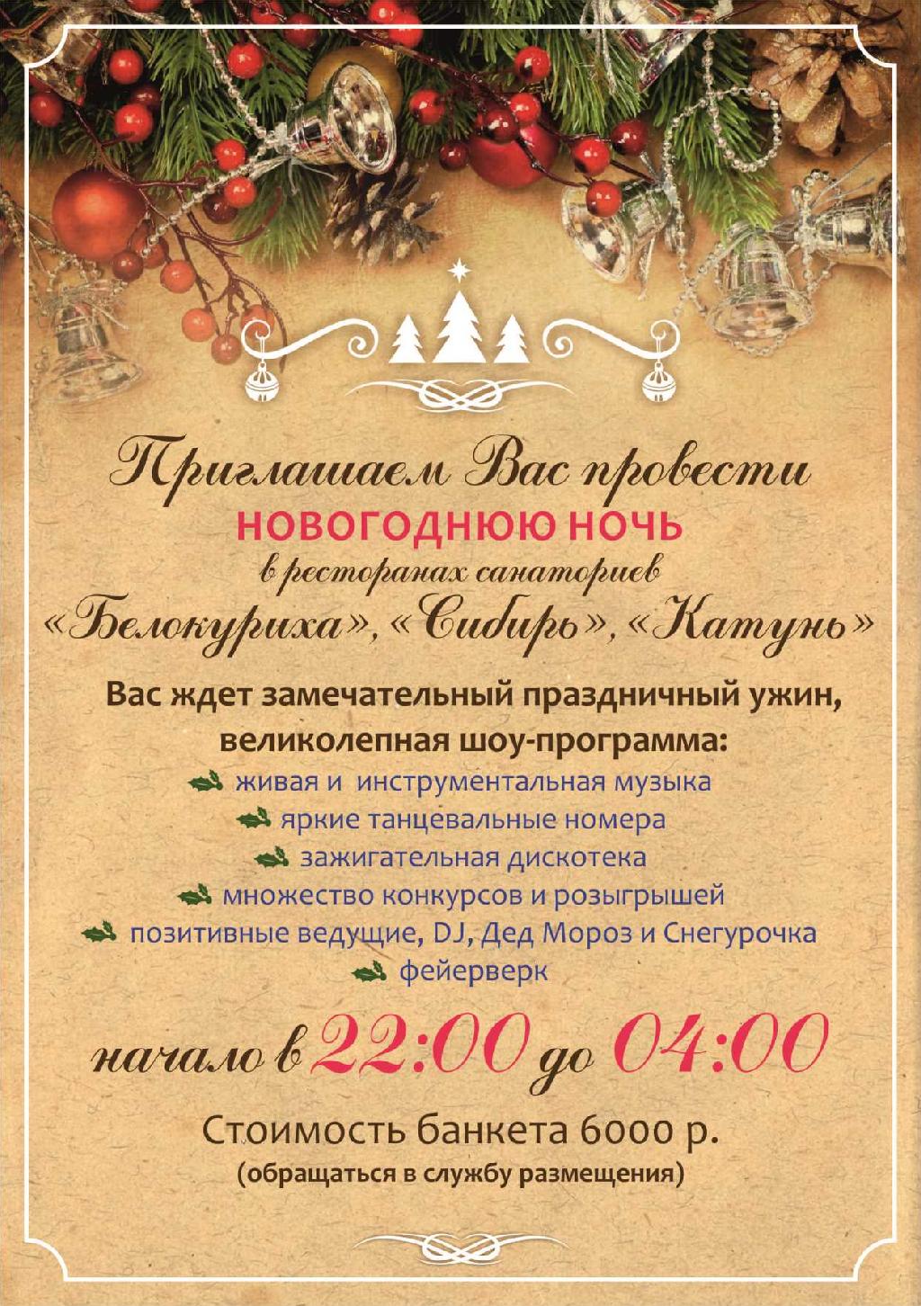 В общем, копите силы и настроение, к встрече Нового года в Белокурихе уже готовы! Даже если сам новогодний ужин для вас сугубо семейный праздник, Белокуриха всю зиму будет сиять для вас праздничными огнями, сверкать ледовыми катками, манить запахом хвои и глинтвейна, и сверкать россыпью белоснежных снежинок...