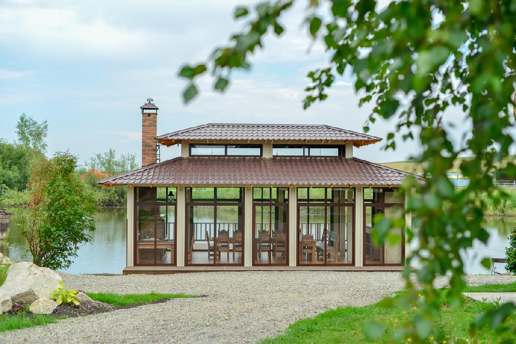 Беседка стоит прямо у воды, на берегу небольшого озера. Все стены беседки - стеклянные, поэтому, находясь в защищенном от непогоды помещении, можно наслаждаться окружающими видами. Это очень удобно, ведь не всегда в день запланированного торжества бывает хорошая погода. А если на улице тепло - окна можно развинуть. Главное - какая красота вокруг!