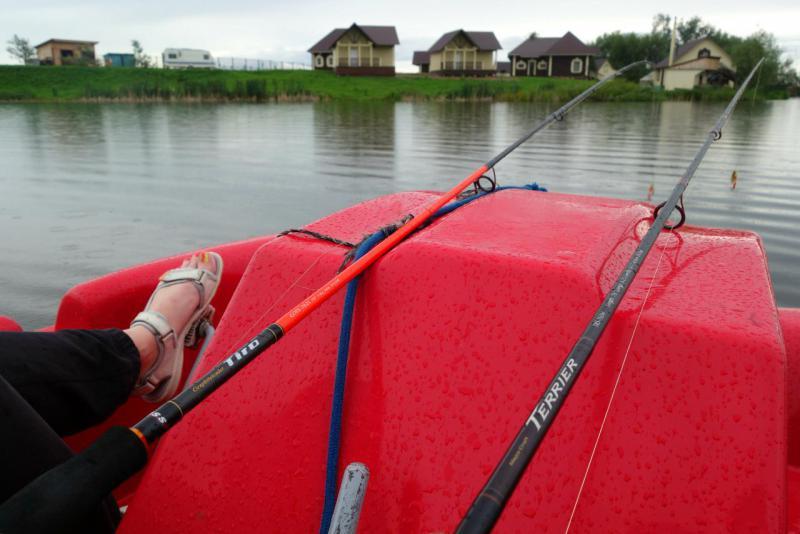 Озеро в Простоквашино решили исследовать на катамаране, на такой технике мы рыбачили впервые, не очень удобно, но забавно. Ловили на вертушки и резину. Рыбу нам разрешили выпускать, кроме щук. Пришлось импровизировать, подсак превратился в садок...