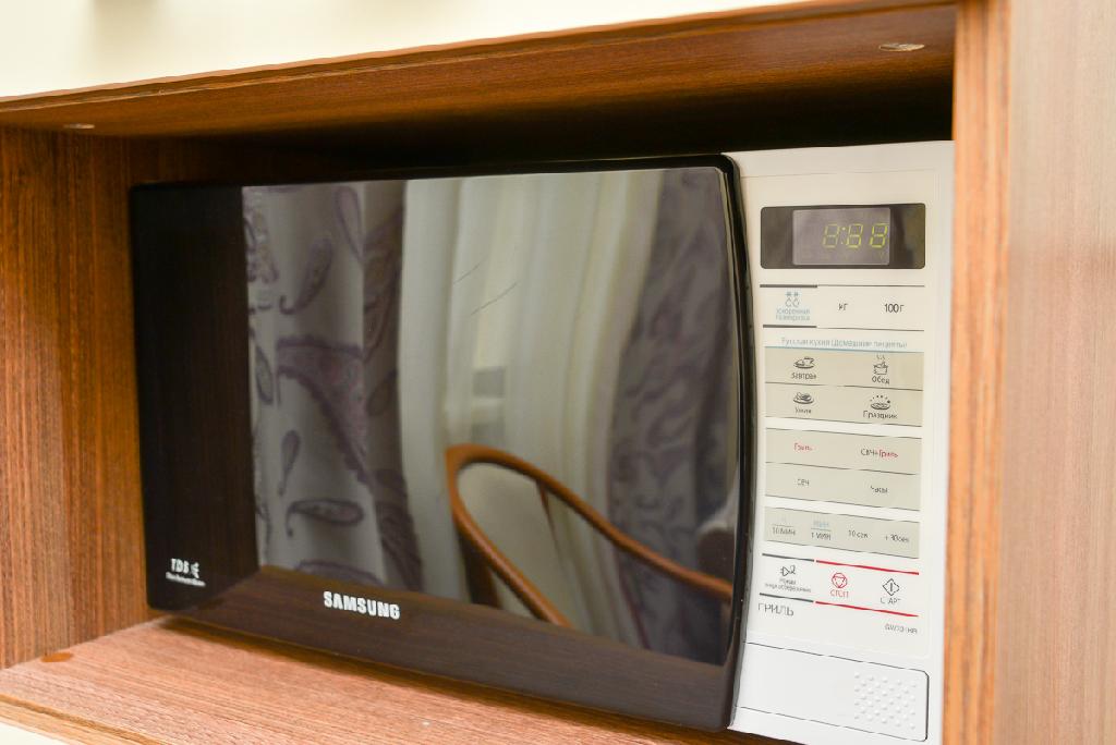 Как и полагается номеру повышенной комфортности, здесь есть не только полный набор посуды, ЖК-телевизор, DVD, но также кондиционер, сейф, утюг и микроволновая печь: