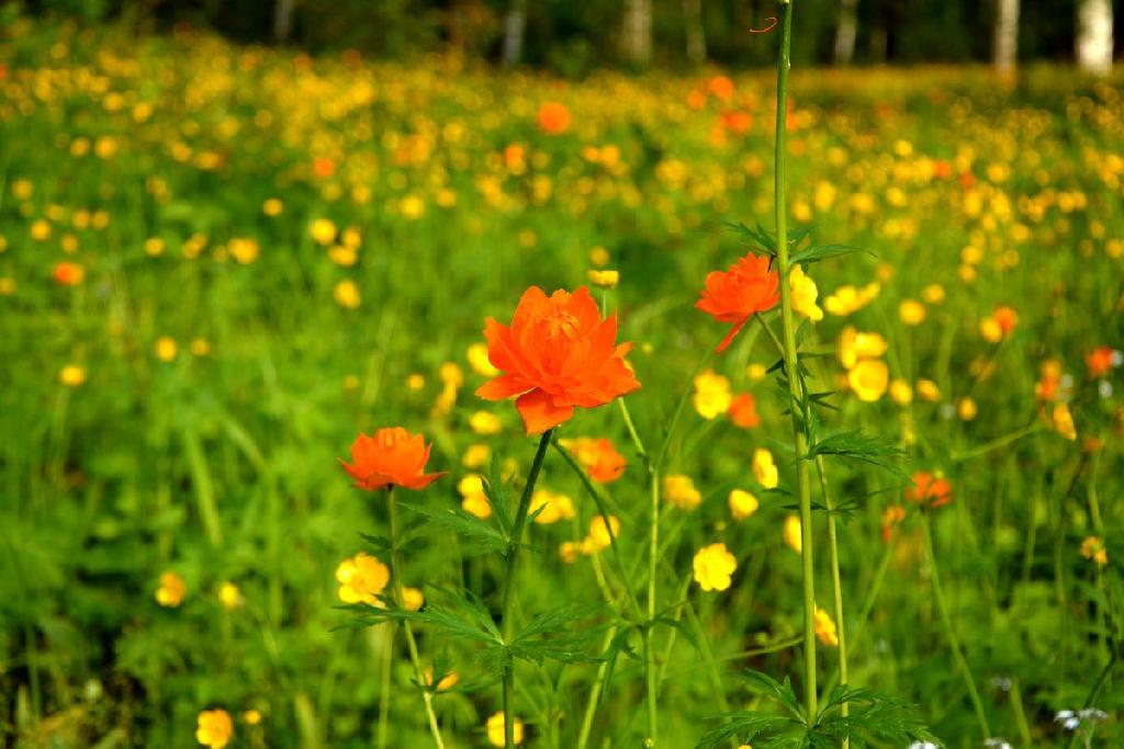 Все вокруг в огоньках огоньков! Растение зовут сибирской розой (жарка, купальница и т.д.). Красив цветок бесподобно. А еще - внесен в Красные книги ряда регионов России, так что лучше не рвать. Кроме того, в некоторых поверьях считается талисманом горных духов. Таким образом, за неприкосновенность огоньков в едином строю стоят юридические и потусторонние силы. И вроде много тут этих цветов, рви - не хочу, но именно из-за такого подхода очень быстро огоньки исчезают близ населенных пунктов. Говорят, чтобы сибирская роза достигла поры цветения, ей нужно потратить более 10 лет. Потому лучше их не трогать - пусть себе растут и радуют людей из года в год.