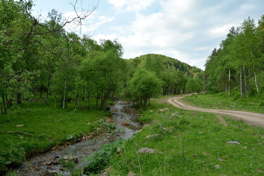 Гора возвышается с одной стороны от дороги, а с другой бежит крупный ручей.
